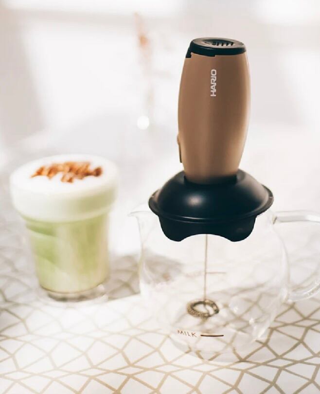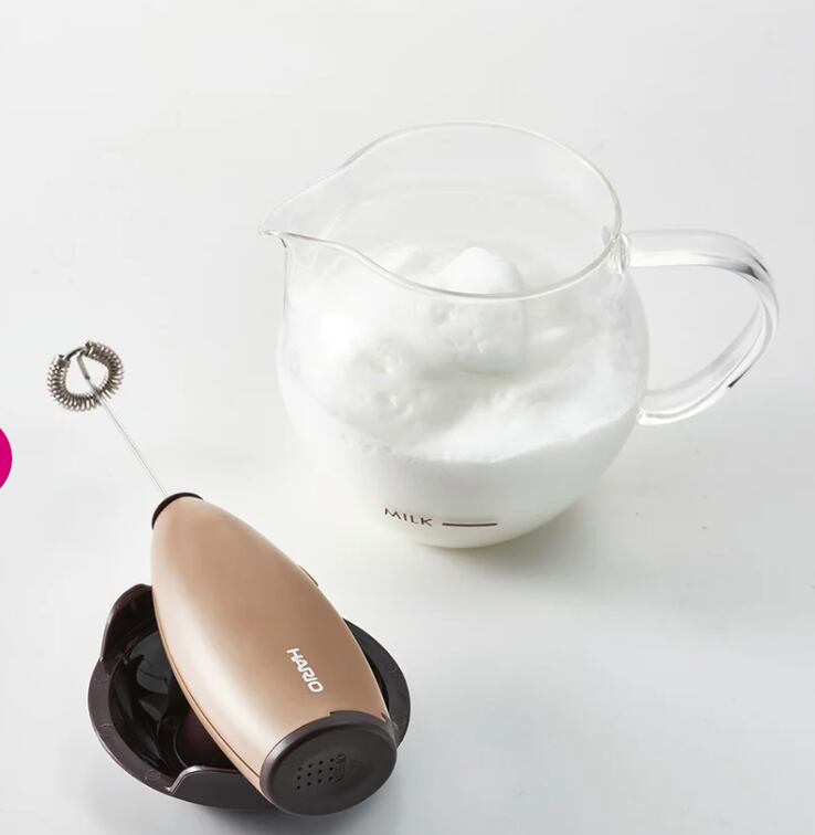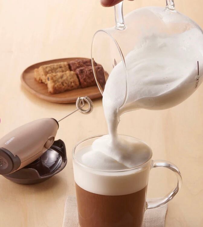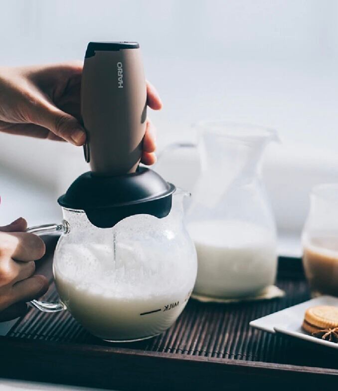 少し傾けスイッチを押し、30〜40秒ほど牛乳を泡立てます。